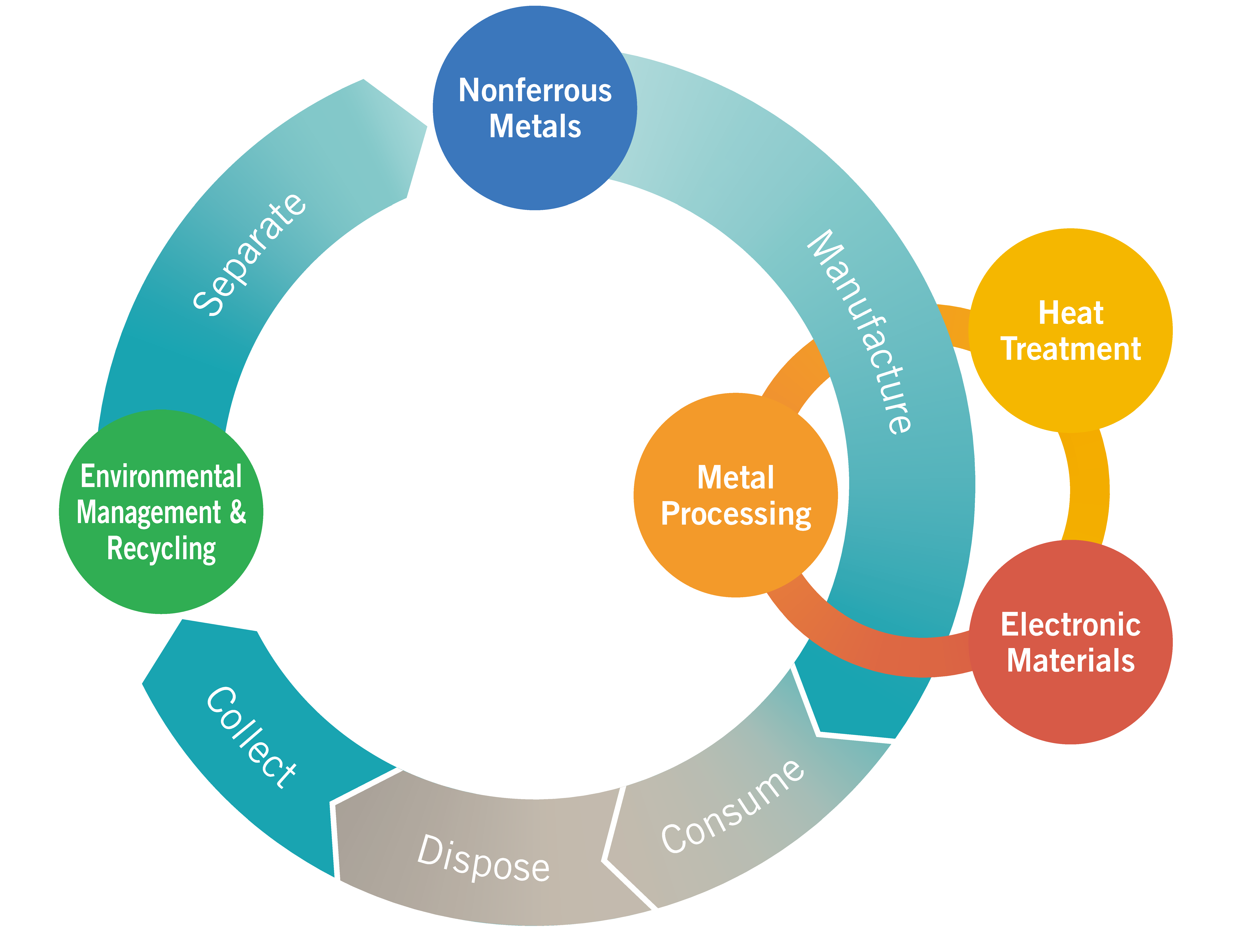 Specifically, our Environmental Management & Recycling Business collects products and other items that have reached the end of their lives and been disposed of. Working together with our Nonferrous Metals Business, they separate resources and regenerate them so that they can be used as materials. Through this process, they detoxify waste and recycle metal, reducing environmental impact. Once the materials are regenerated, our Electronic Materials Business, Metal Processing Business, and Heat Treatment Business use advanced technologies to further enhance the materials’ value, contributing to more advanced, more functional products such as automobiles and electronic devices. Fulfilling Japan’s national strategy of realizing a circular economy will require true circularity that goes beyond simple recycling. We believe that the Company’s recycling-oriented business model is an effective approach to achieve this goal.