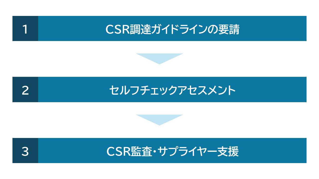 当社グループでは、サプライチェーン全体でCSR調達を推進していくために、「CSR調達方針」「CSR調達ガイドライン」に基づいたサプライチェーンマネジメントを実施しています。